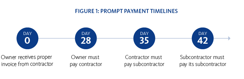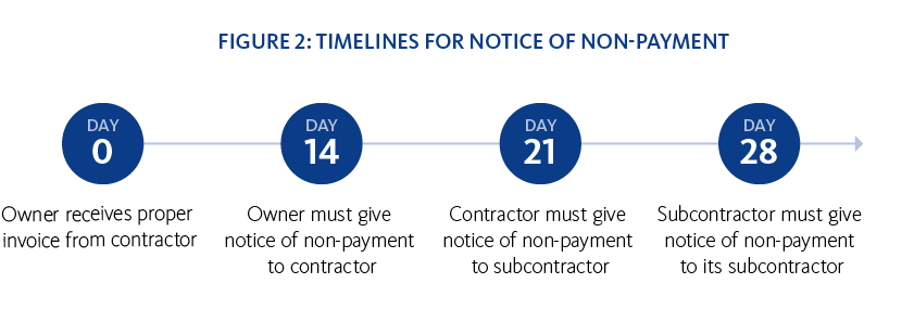 The prompt payment regime introduces swift payment deadlines that were inspired by similar reforms introduced over 20 years ago in the United Kingdom. The clock starts ticking once the owner receives a “proper invoice” from its general contractor, either on a monthly basis or as otherwise agreed in the contract. The owner must either pay within 28 calendar days (Figure 1) or dispute within 14 calendar days, describing the reasons for non-payment (Figure 2). In turn, the contractor must either pay its subcontractors within seven calendar days of receipt of payment (Figure 1) or send notices of dispute within seven calendar days (Figure 2).