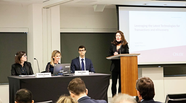 Le séminaire présenté par l’équipe d’Osler à l’œuvre a donné aux clients un aperçu du fonctionnement des plateformes internes Osler à l’œuvre du cabinet, qui utilisent la technologie pour livrer un ensemble simplifié de services de vérification diligente et de services liés aux clôtures. Les équipes d’Osler à l’œuvre — Services transactionnels et d’Osler à l’œuvre — Gestion de la preuve ont utilisé des outils automatisés d’examen de documents et d’apprentissage automatique dans le cadre de leur pratique. Voici quelques exemples éloquents illustrant comment Osler a su résoudre les problèmes de ses clients au moyen de la technologie. Sarah Millar, associée et chef d’Osler à l’œuvre — Gestion de la preuve (un service qui simplifie les exigences liées à l’examen de la preuve et des documents), et Natalie Munroe, chef d’Osler à l’œuvre — Services transactionnels (un service qui simplifie les mandats liés aux opérations, notamment la vérification diligente, l’analyse des contrats et les clôtures), a expliqué durant le séminaire l’importance de bien comprendre l’application de ces outils pour simplifier le travail et réduire les frais juridiques. Elles ont également indiqué que l’utilisation de ces technologies ne visait aucunement à s’approprier le travail des juriprofessionnels, mais à le compléter.