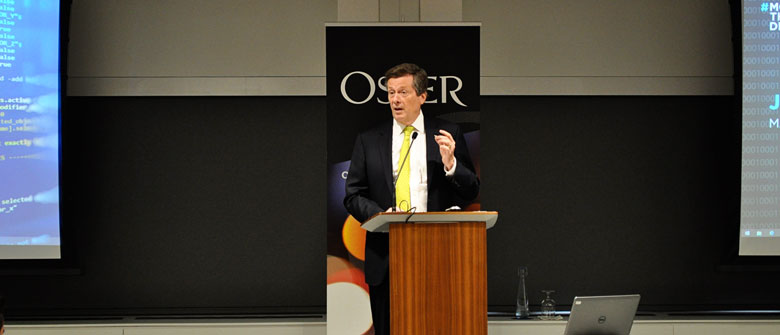 Le maire Tory a remercié Osler de tenir cet événement et a parlé de la sous-représentation des femmes dans le secteur technologique, ce qui, a-t-il dit, « n’est pas bien » et « n’est pas avisé, car nous nous privons alors, en raison du manque de femmes dans ce secteur, du vaste bassin de talents auquel nous avons accès dans la ville ». Afin de favoriser une plus grande représentation des femmes dans le secteur technologique, il a promis de prioriser les événements qui démontrent « un engagement véritable à l’égard de l’appui à la diversité au sein des groupes d’experts… et un effort réel pour s’assurer qu’ils sont composés de femmes et de gens aux antécédents diversifiés ».